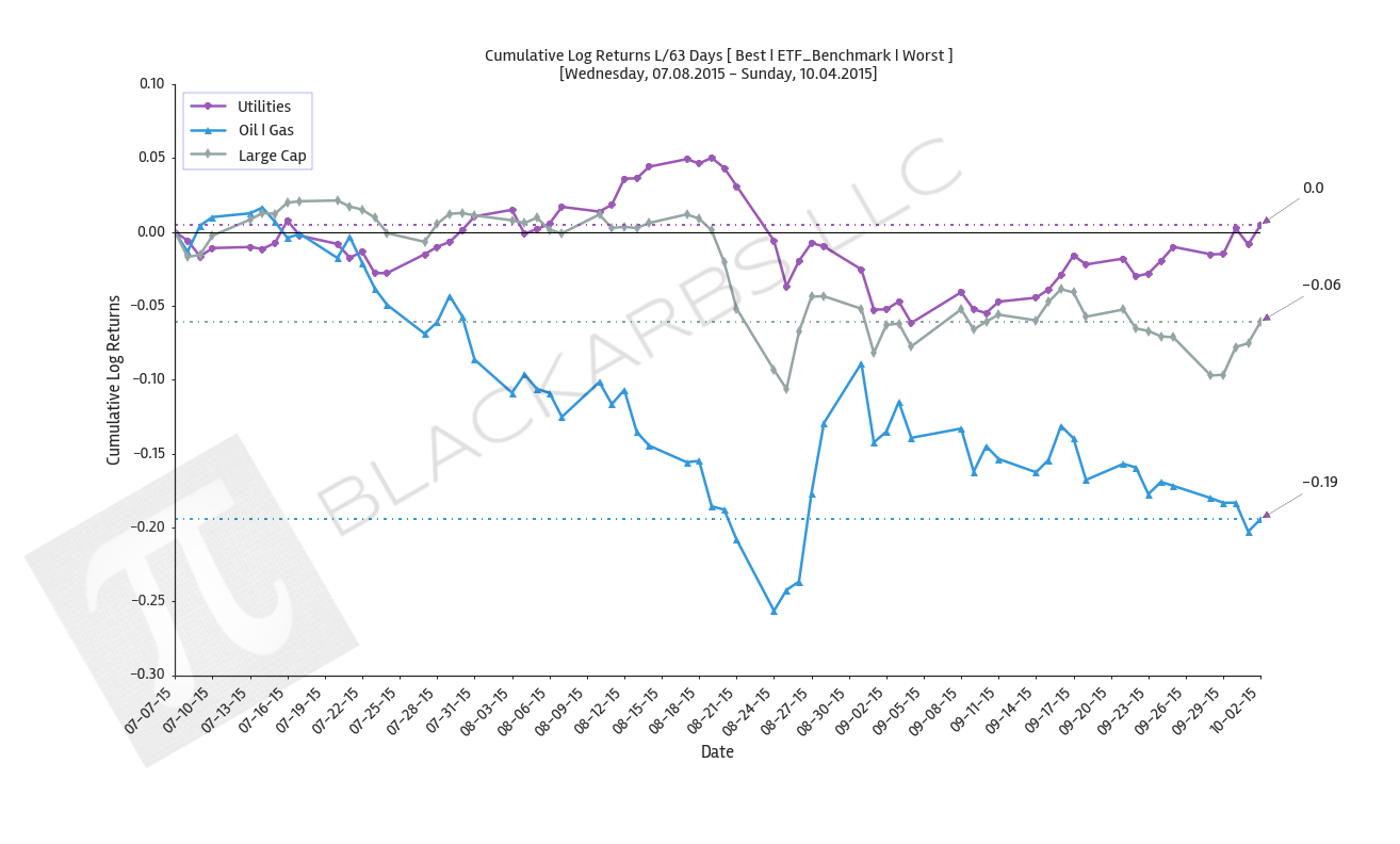 These charts visualize the cumulative return performance of the best and worst performing asset classes over the specified period. These best and worst asset classes are then compared to a benchmark ETF composite represented by the Large Cap category.