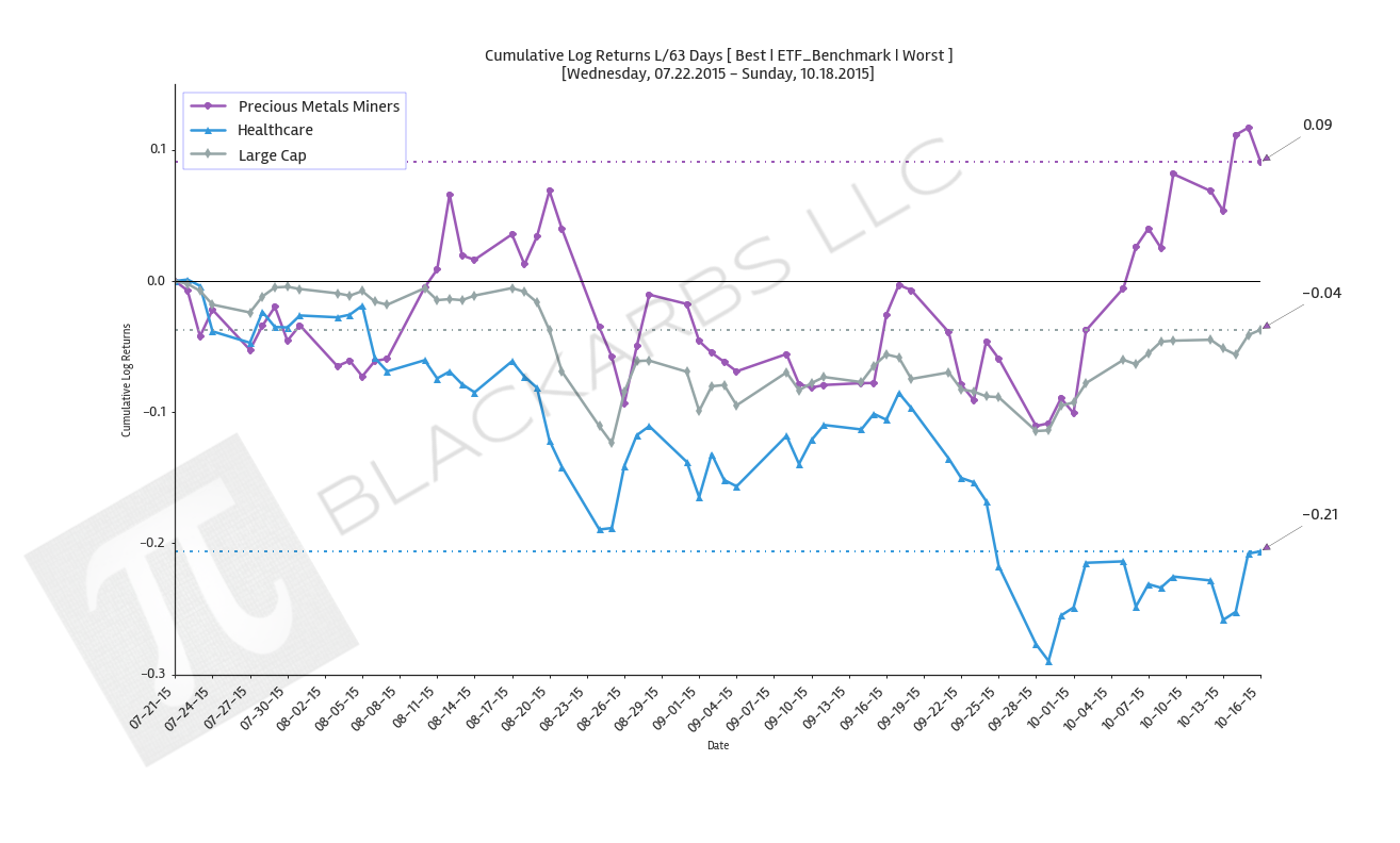 These charts visualize the cumulative return performance of the best and worst performing asset classes over the specified period. These best and worst asset classes are then compared to a benchmark ETF composite represented by the Large Cap category.