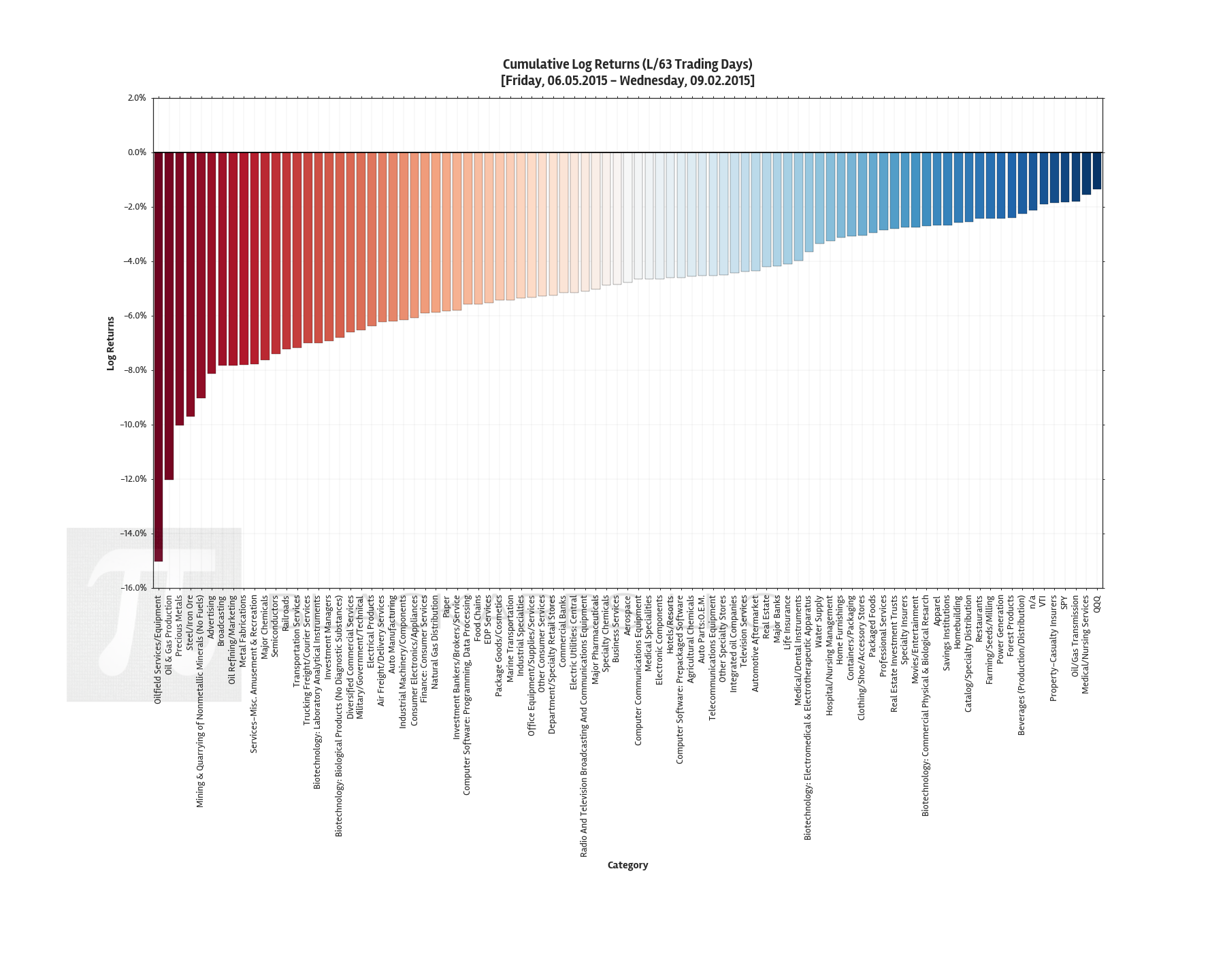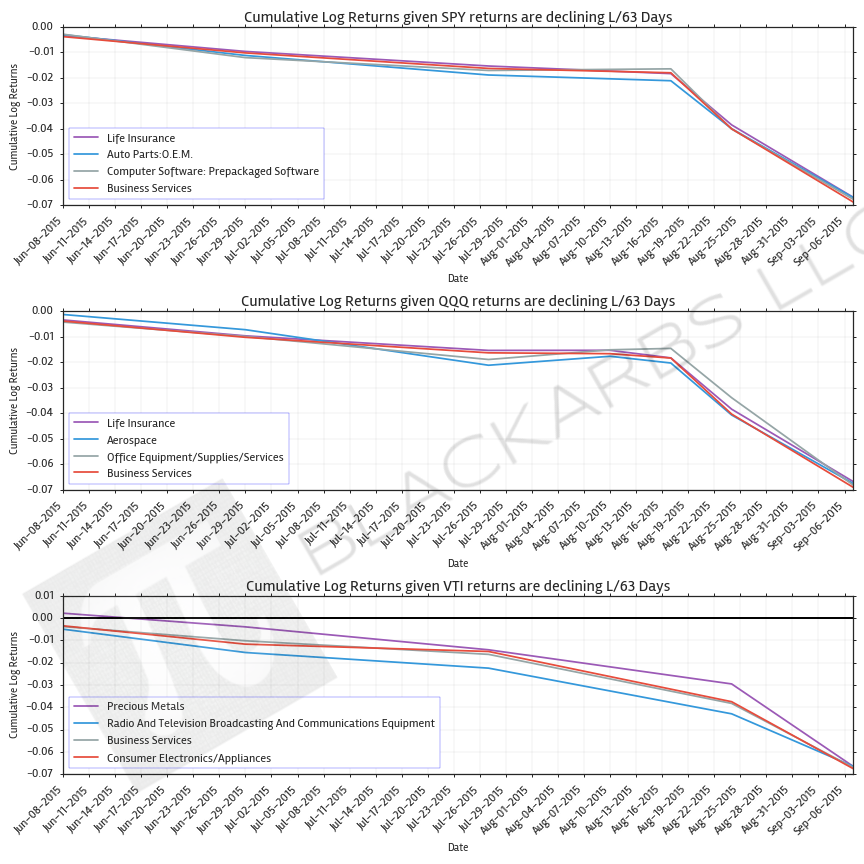 During the last quarter (Last 63 Trading Days) the best industry performance given declining returns in SPY are: Life Insurance, Auto Parts 0.E.M., Computer Software: Prepackaged Software, and Business Services. I find it surprising that Business Services would be a relative outperformer for all 3 benchmark ETFs.