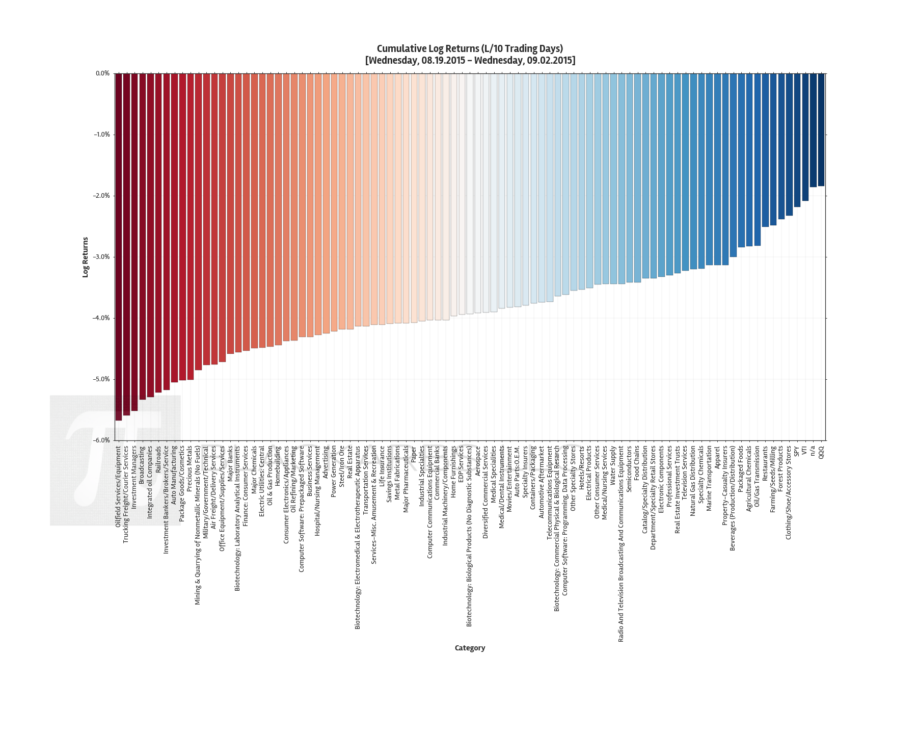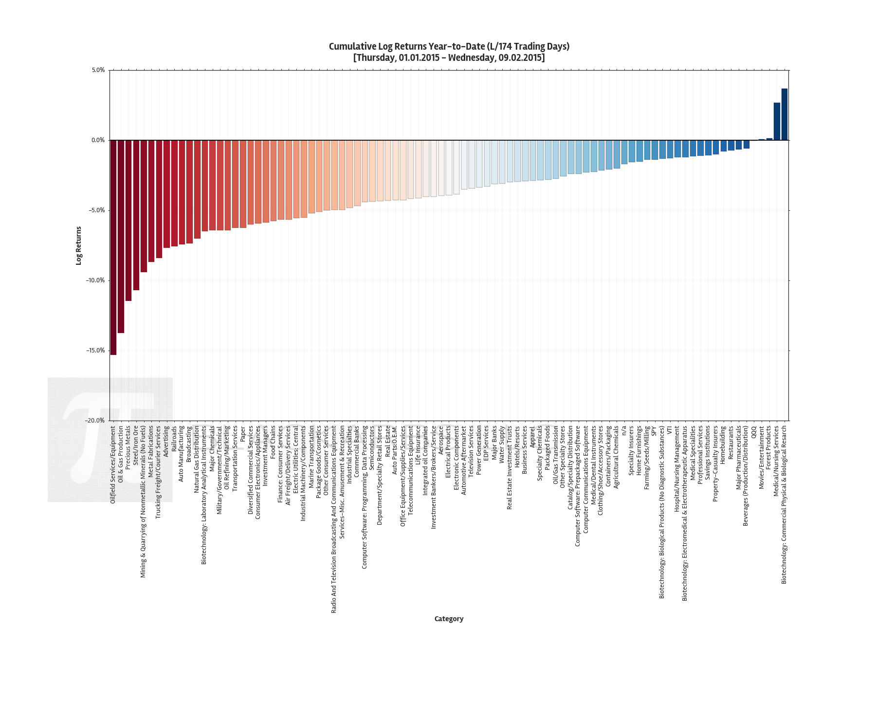 In fact you'd have to back out to view industry group performance Year-to-Date, to find any industry groups with positive cumulative returns. Those industries are: Biotechnology: Commercial Physical & Biological Research, Medical/Nursing Services, Forest Products, and Movies/Entertainment.