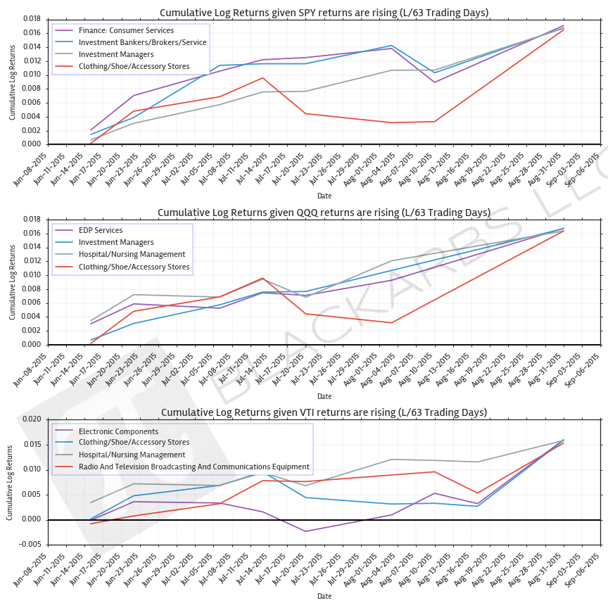 First I examined the cumulative return momentum over various lookback periods. Then I examined which industry groups had the best cumulative return performance given a benchmark ETF’s returns are rising (declining).