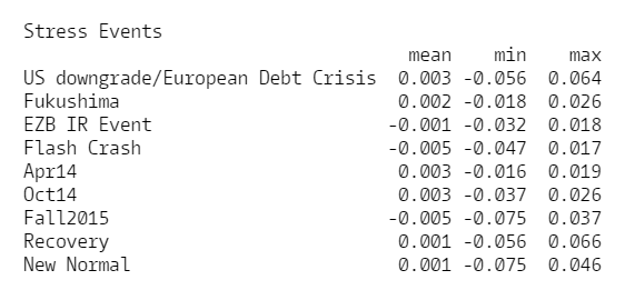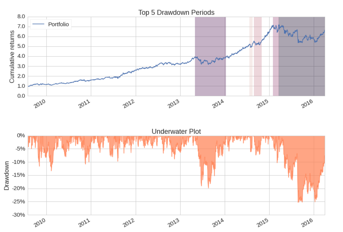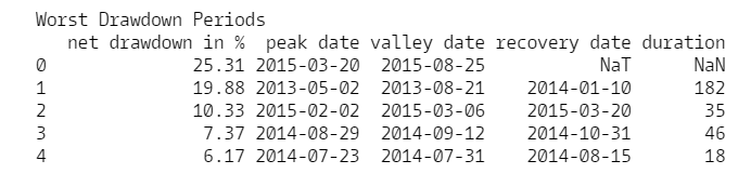 - The worst drawdown periods statistics show that the risk-parity approach suffered dramatically in 2015 and did not recover before the end of the backtest period significantly underperforming the inverse risk-parity approach which did recover before the end of the backtest.