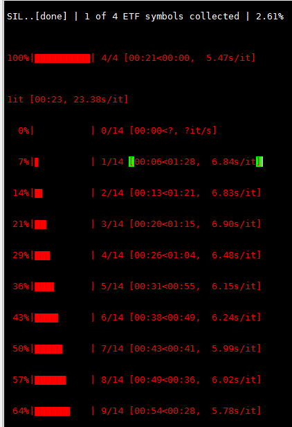 If there are any exceptions or errors, we log it and then append the symbol which caused the error to our `etf_missing_symbols` list for tracking, and continue the loop. The code below the loop is for tracking purposes while the code is running. Note the 'time.sleep()' function which is probably overly complicated but on some level necessary. Essentially all it does is force the code to pause for a random period of time between 0.5 and 1.5 seconds. This is done so we don't overwhelm the servers although I'm sure Barchart.com can handle the load.