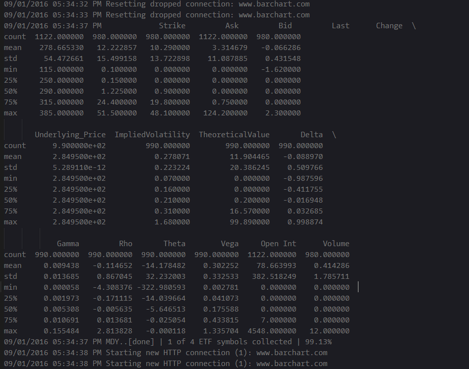 As you can see it's a plain text file tracking our connection to Barchart.com, and after each symbol is aggregated it outputs the `data.describe()` function from pandas on our supersized symbol dataframe before we add it to our HDF5 store.