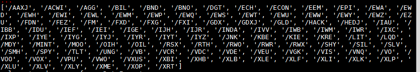Next we define a list, or in this case, a dictionary of symbols. I've used this dictionary before and it uses the ETF categories as its keys and a list of ETF symbols as its values.