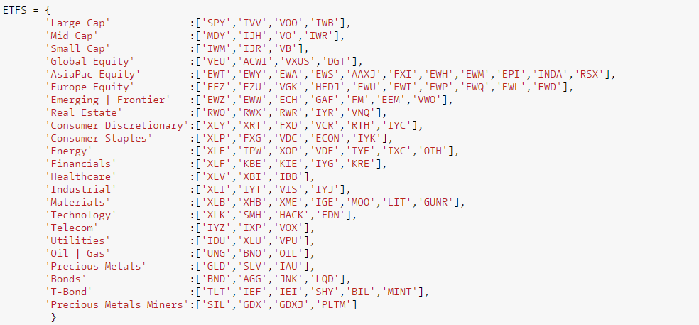 My strategy differs in that I arbitrarily chose 1 and 4 week holding periods to study. Additionally this strategy only analyzes a cross-section of ETFs instead of individual stocks. I chose ETFs because liquidity and data quality concerns are minimized. Here are the selected ETFs under analysis.