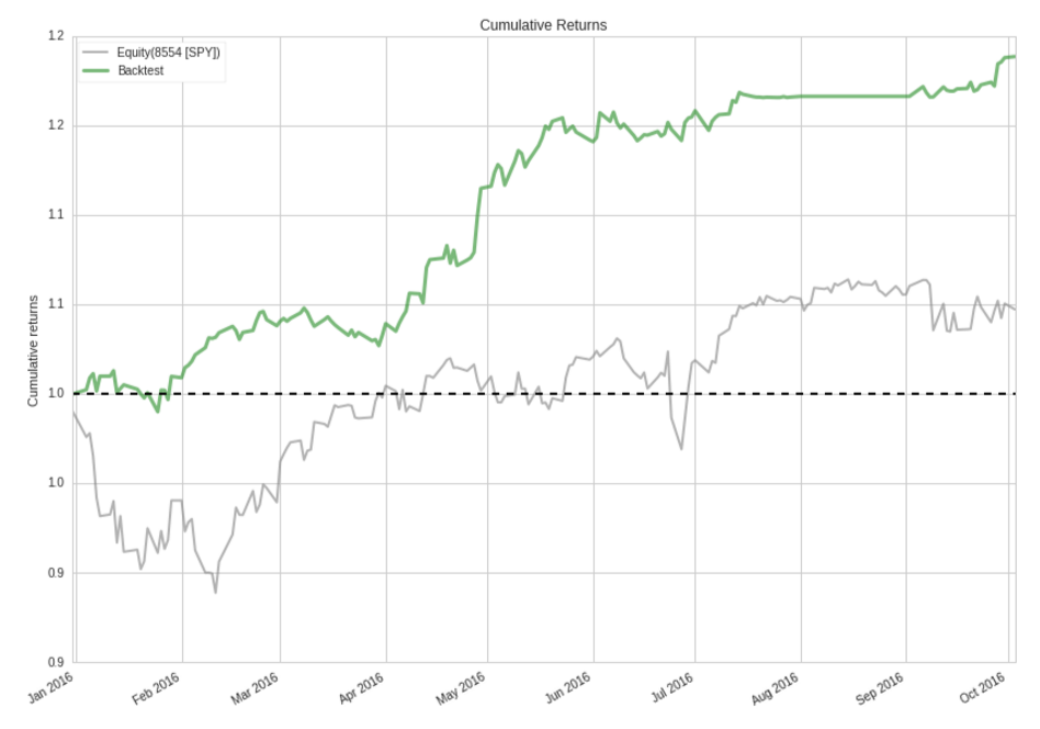 A quick glance shows that the strategy has had strong cumulative return performance over the first three quarters of 2016. We can see the gap in the strategy results during the period I was searching for a new options data provider.
