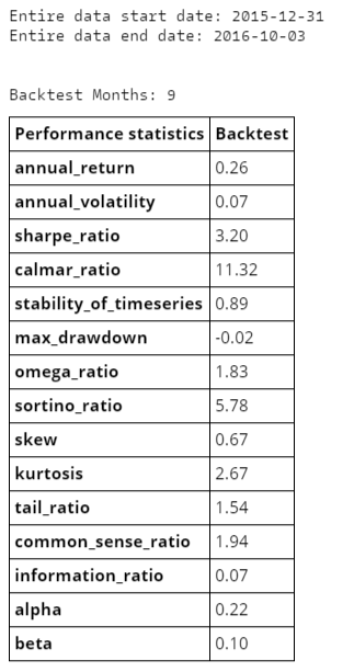 Annualized returns are extremely healthy at 26% with annualized volatility in the single digits. The sharpe ratio is impressive at 3.2 and the calmar ratio is double digits reflecting the low maximum drawdown this strategy has sustained. Some features we would hope for include a positive skew which indicates a higher likelihood of positive returns. Annualized alpha is substantial at 22% while maintaining very low beta exposure to the benchmark (SPY) at 10%. These numbers are fantastic but we must pump the brakes on our excitement as the strategy only has 9 months of results. Furthermore, at least 1.5 of the 9 months the strategy was not tracked due to the downfall of the Yahoo Finance options API.
