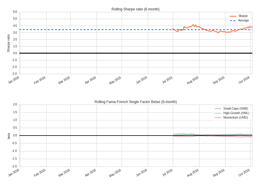 Rolling portfolio beta relative to the SPY benchmark is near zero. Six month rolling sharpe has been consistently high around 3 for the last three months. The strategy has near zero sensitivity to the rolling Fama-French factors which is a positive sign.