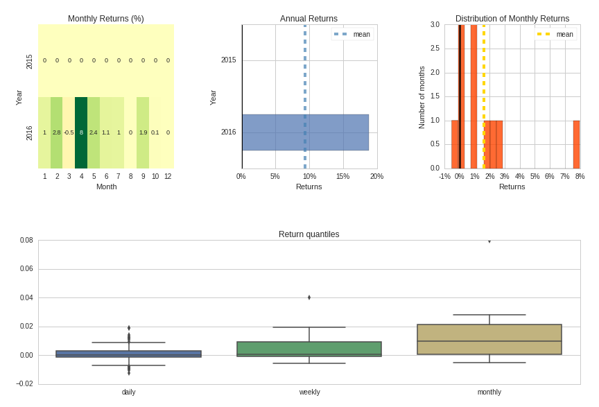 Here I use Quantopian's portfolio analytics tool to further analyze the strategy. Note that all returns are simulated.