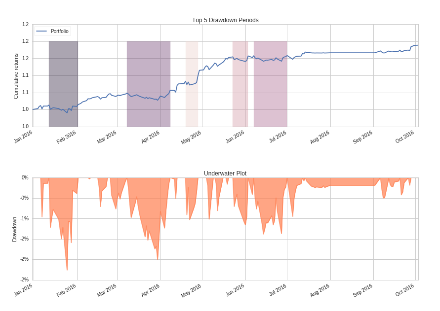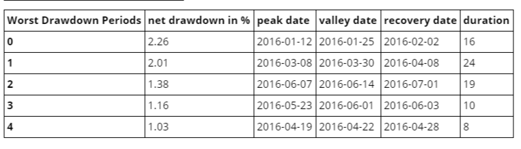 Drawdowns have been manageable and very small, with the max at 2.26% only lasting 16 days. Max drawdown duration has been approximately 1 month or 24 days.