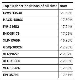 Here are the maximum long and short portfolio weights. ~22% isn't awful but it's not ideal. Again this is a reflection of slippage and lack of timely fills. However it is not all bad as seen below.