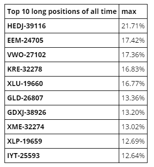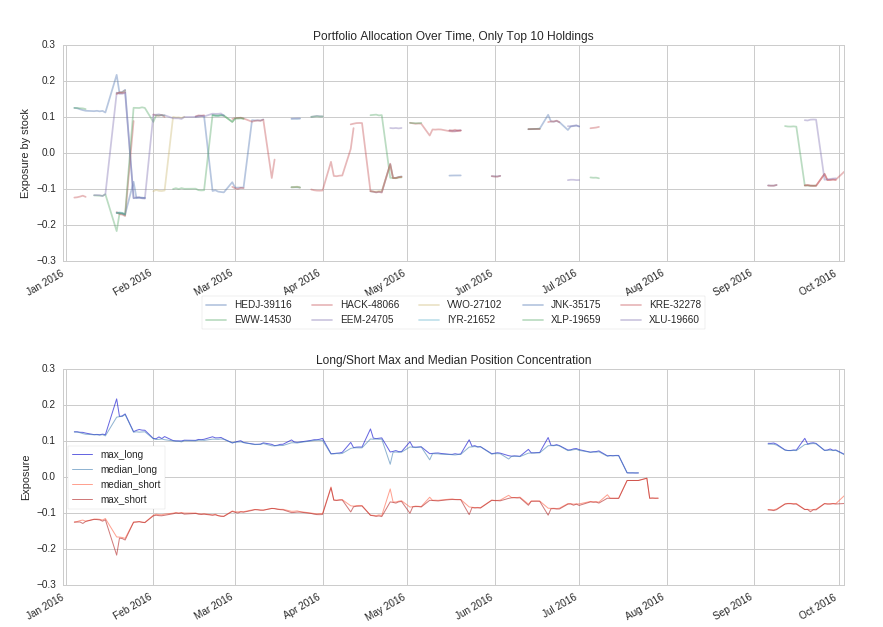 This strategy turns over almost once a week, as designed, with daily trading volume averaging a little over 20,000 shares. Gross leverage very rarely exceeds two. Based on the gross leverage we can see that the strategy struggles to get filled on the more thinly traded ETFs which results in the gross leverage rarely achieving its target leverage of two. This includes my custom slippage model which increases the bar volume limit to 50%, which means up to 50% of a minutes bar's volume can be traded by the strategy.