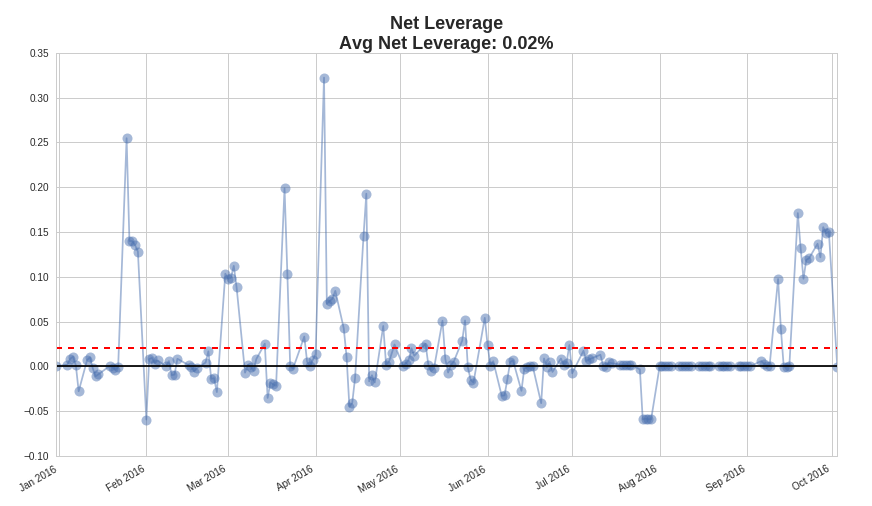 Clearly those overweight positions are the result of slippage during portoflio turnover as those allocations are represented by short duration spikes on both the long and short side in the Portfolio Allocation Over Time plot. More importantly, in the Long/Short Max and Median Position Concentration chart we can see that during the position weight spikes, the portfolio has had near offsetting positions such that it is not unhedged or overexposed to either the long or short side for long periods of time. We can confirm this by plotting the net leverage and average net leverage.