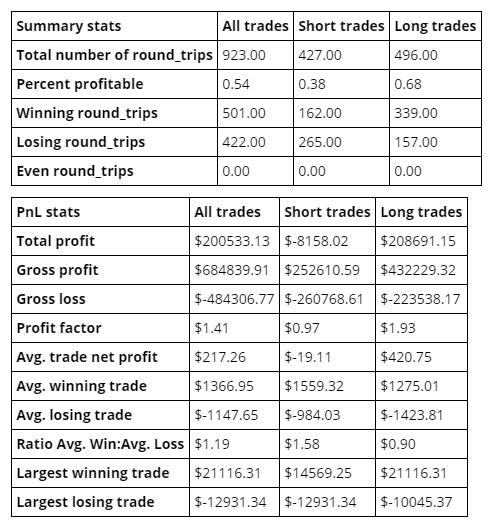 First item that jumps out is the quantity of losing round_trips is greater than winning round_trips for short trades which is interesting. Only 38% of the short trades are profitable. However, look at the Profit factor row. For short trades it is very close to 1 indicating near breakeven. How is that possible? Look at the Ratio Avg. Win:Avg Loss. Short trades have the highest ratio at $1.58. This means that average winning trade is almost 1.6x the size of the average losing trade in dollar terms. The Profit factor for the long trades is a healthy $1.93 and the strategy overall shows an investable profit factor of $1.41.
