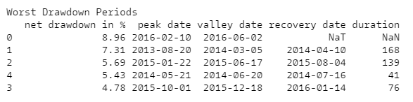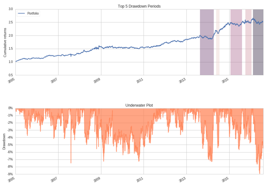 Drawdowns are manageable and realistic (<10%). The drawdown duration is also reasonable in that the longest duration was approximately 8 months. It is somewhat concerning that the largest drawdowns all occurred within the last 3 years. This would definitely be something to track closely.