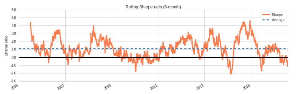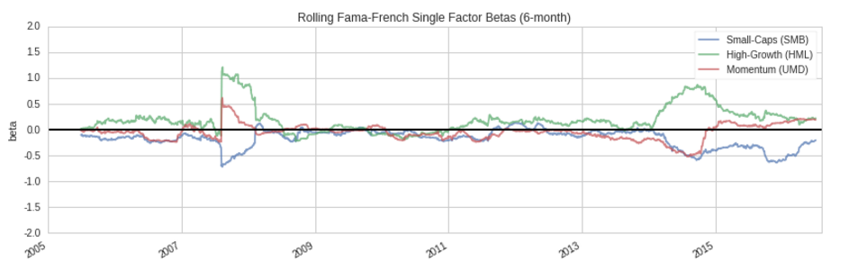 Rolling Sharpe is ok; the average is greater than 1 which is a positive. Rolling beta is effectively zero which is indicative of a true market neutral strategy. Overall the strategy is indifferent to the Fama-French factors except for ~2008 and ~2014-15.
