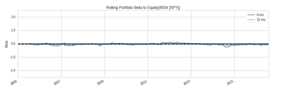 Annual return is a solid 8% over an ~12 year period. Annual volatility is in the single digits at ~7% per year! Sharpe ratio is greater than 1, and max drawdown is also single digits at 9%! There is slight negative skewness which is ok. Alpha is a healthy 8%. Beta is effectively zero! All are solid traits of an effective market neutral strategy.