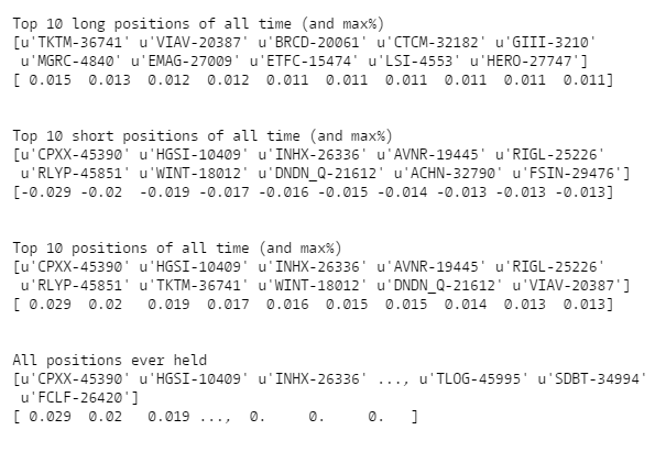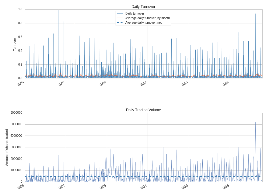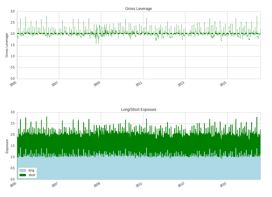 Gross leverage never exceeds the Quantopian max of 3x. However, what is not shown is that net leverage was consistently near zero indicating long and short positions were balanced. The Long/Short Exposure plot shows this quite well. Turnover seems reasonable given that the strategy maintained anywhere from ~400-500 positions at a time. Trading volume seems to be increasing over time but that could be illusory due to the recent large spike in late 2015/early 2016. Position exposure is what we would expect with the top long position weighted less than 2% and the top short position less than 3%.