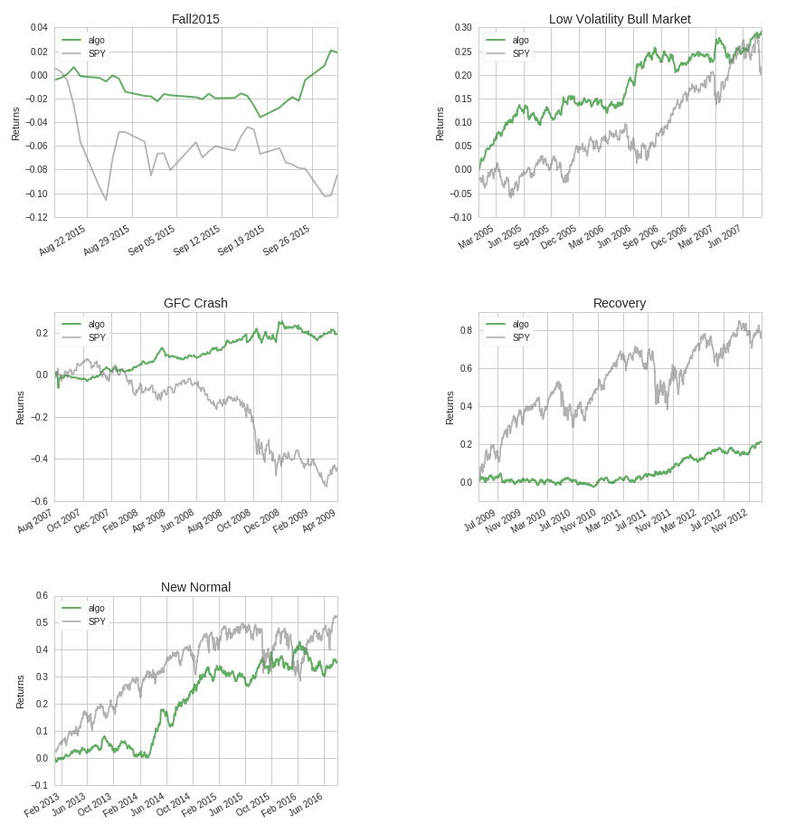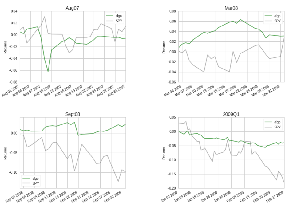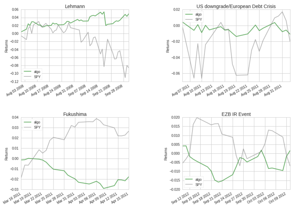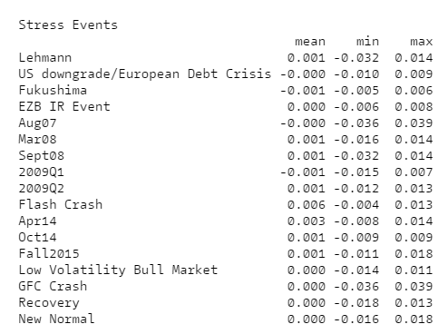 The strategy is mostly indifferent to the stress events identified above. During 13 of 17 events the strategy recorded non-negative average returns. Overall, the strategy appears to be unaffected by various types of market stress events.