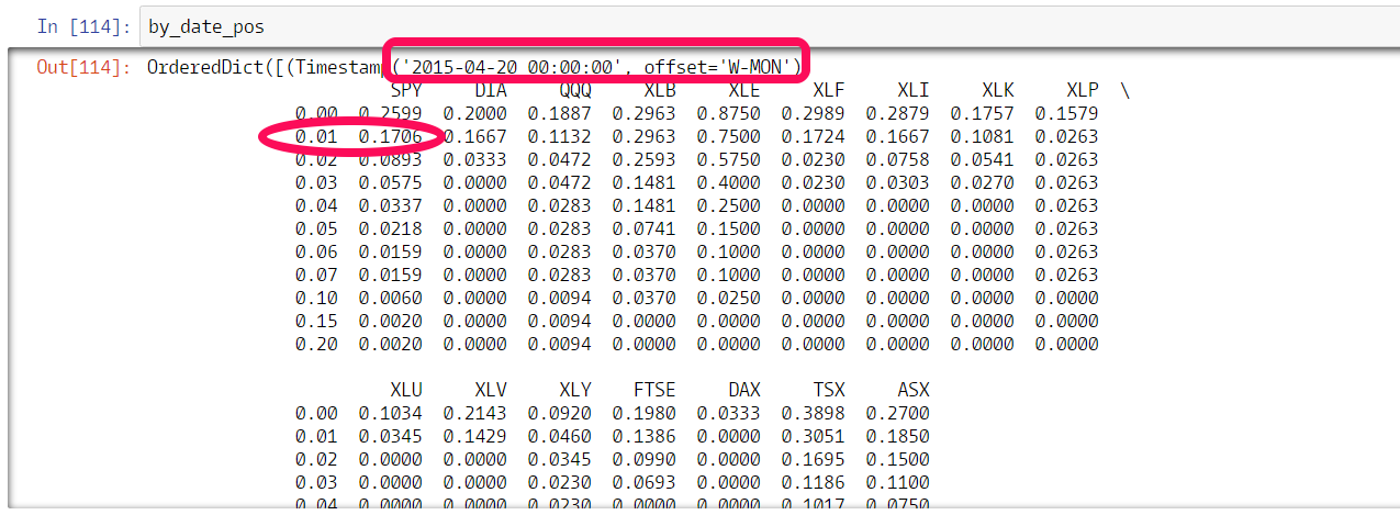 Here's a sample output after running the above script. Using the below example focusing in on the SPY column, the data would be interpreted as, on Monday 4/20/2016, ~17% of SPY's component stocks had gained 1% or more over the previous week.