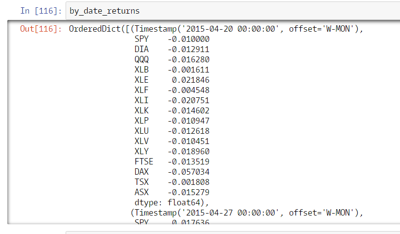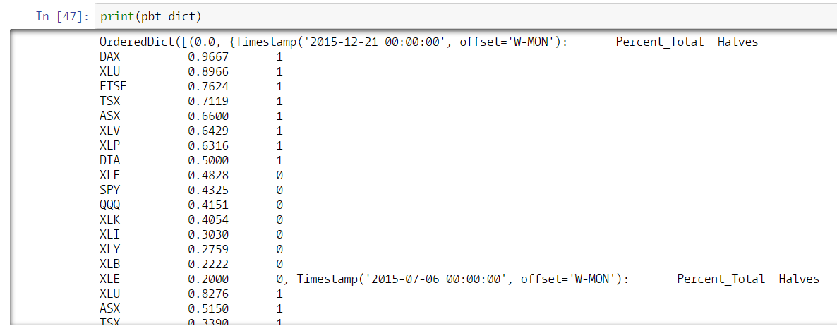 Below I define `all_etf_symbols` as an ordered dictionary with key, value pairs equivalent to the ETF symbol, and a list of the ETF's component stocks. For brevity's sake I omit some of the data cleanup processes I did to construct the dictionary.