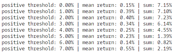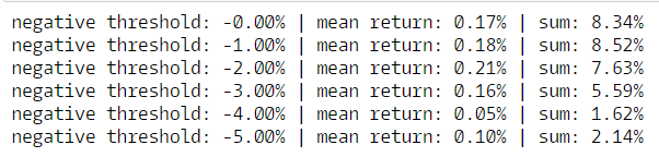 Now I calculate a theoretical holding period return of one week. To test whether mean reversion is a tradeable opportunity, this return assumes you long the bottom half of stocks i.e., the stocks with lowest percentage of components exceeding a return threshold, while shorting the top half of stocks i.e., the stocks with the highest percentage of components exceeding a return threshold. Afterwards I print out the average Long - Short return and the cumulative return for each return threshold.