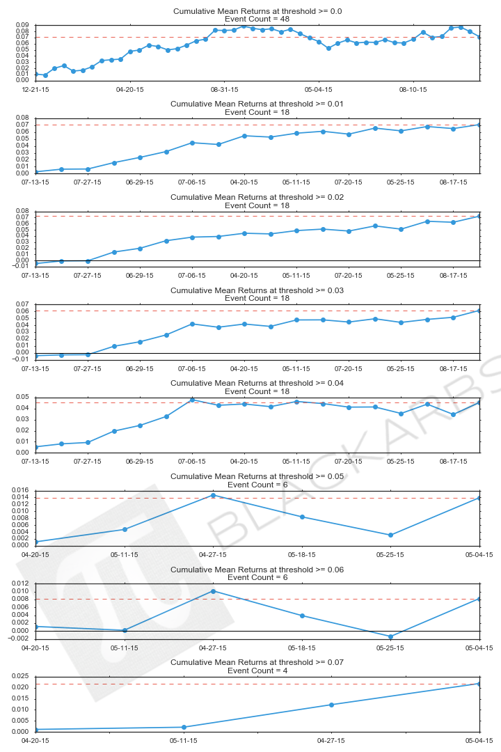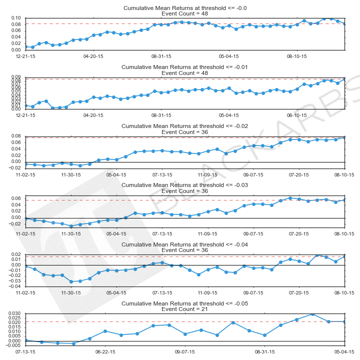 We can see some interesting results already. Now we do the same analysis for the negative return thresholds. This time we take a theoretical long position in the ETF's with the highest percentage of their component stocks falling below a specified threshold while shorting the ETF's with the lowest percentage of their component stocks falling below the threshold.