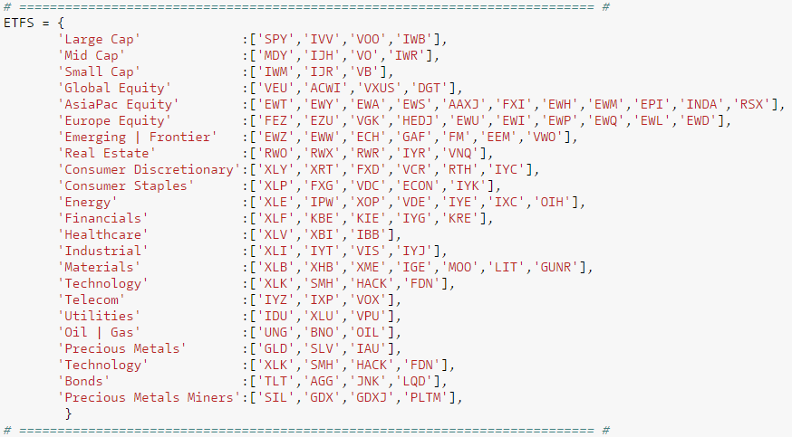 In the paper that inspired this series ("What Does Individual Option Volatility Smirk Tell Us About Future Equity Returns") the authors' research shows that their calculation of the Option Volatility Smirk is predictive of equity returns up to 4 weeks. Therefore, each week, I will calculate the Long/Short legs of a portfolio constructed by following their criteria as closely as possible. However this study will focus on ETF's as opposed to single name equities. I will then track the results of the Long/Short portfolio, in equity returns, cumulatively for 4 weeks before rotating out of that portfolio. The ETF's are selected from the following groups: