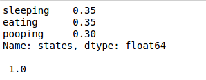 Imagine you have a very lazy fat dog, so we define the state space as sleeping, eating, or pooping. We will set the initial probabilities to 35%, 35%, and 30% respectively.