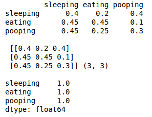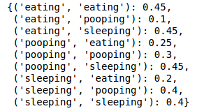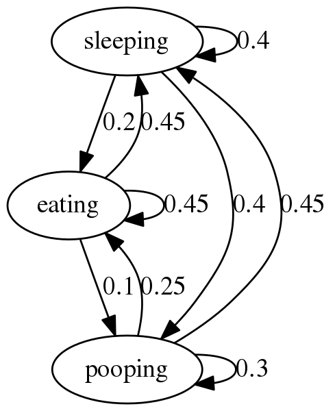Not bad. If you follow the edges from any node, it will tell you the probability that the dog will transition to another state. For example, if the dog is sleeping, we can see there is a 40% chance the dog will keep sleeping, a 40% chance the dog will wake up and poop, and a 20% chance the dog will wake up and eat.