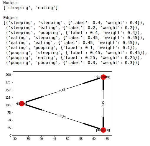 To do this requires a little bit of flexible thinking. Networkx creates Graphs that consist of nodes and edges. In our toy example the dog's possible states are the nodes and the edges are the lines that connect the nodes. The transition probabilities are the weights. They represent the probability of transitioning to a state given the current state.