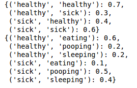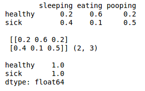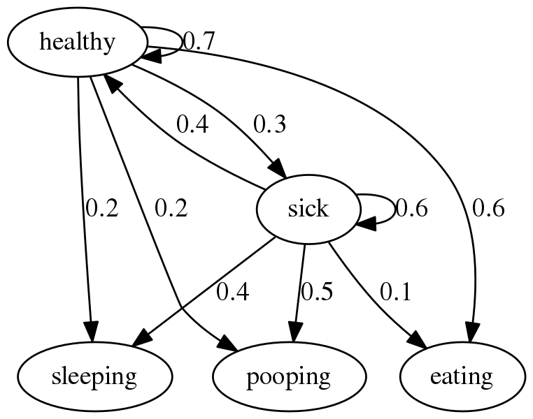 The hidden Markov graph is a little more complex but the principles are the same. For example, you would expect that if your dog is eating there is a high probability that it is healthy (60%) and a very low probability that the dog is sick (10%).