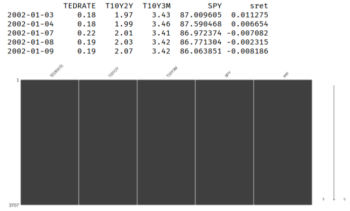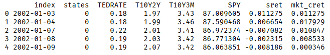 In this example, the observable variables I use are: the underlying asset returns, the Ted Spread, the 10 year - 2 year constant maturity spread, and the 10 year - 3 month constant maturity spread.