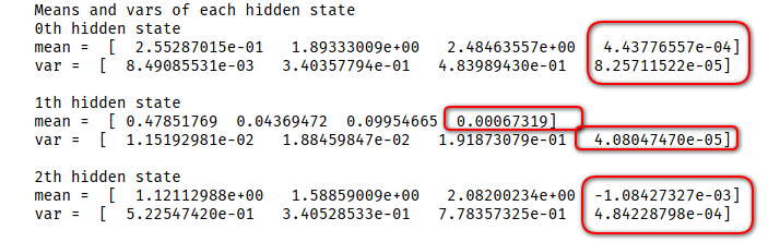 In the above image, I've highlighted each regime's daily expected mean and variance of SPY returns. It appears the 1th hidden state is our low volatility regime. Note that the 1th hidden state has the largest expected return and the smallest variance.The 0th hidden state is the neutral volatility regime with the second largest return and variance. Lastly the 2th hidden state is high volatility regime. We can see the expected return is negative and the variance is the largest of the group.