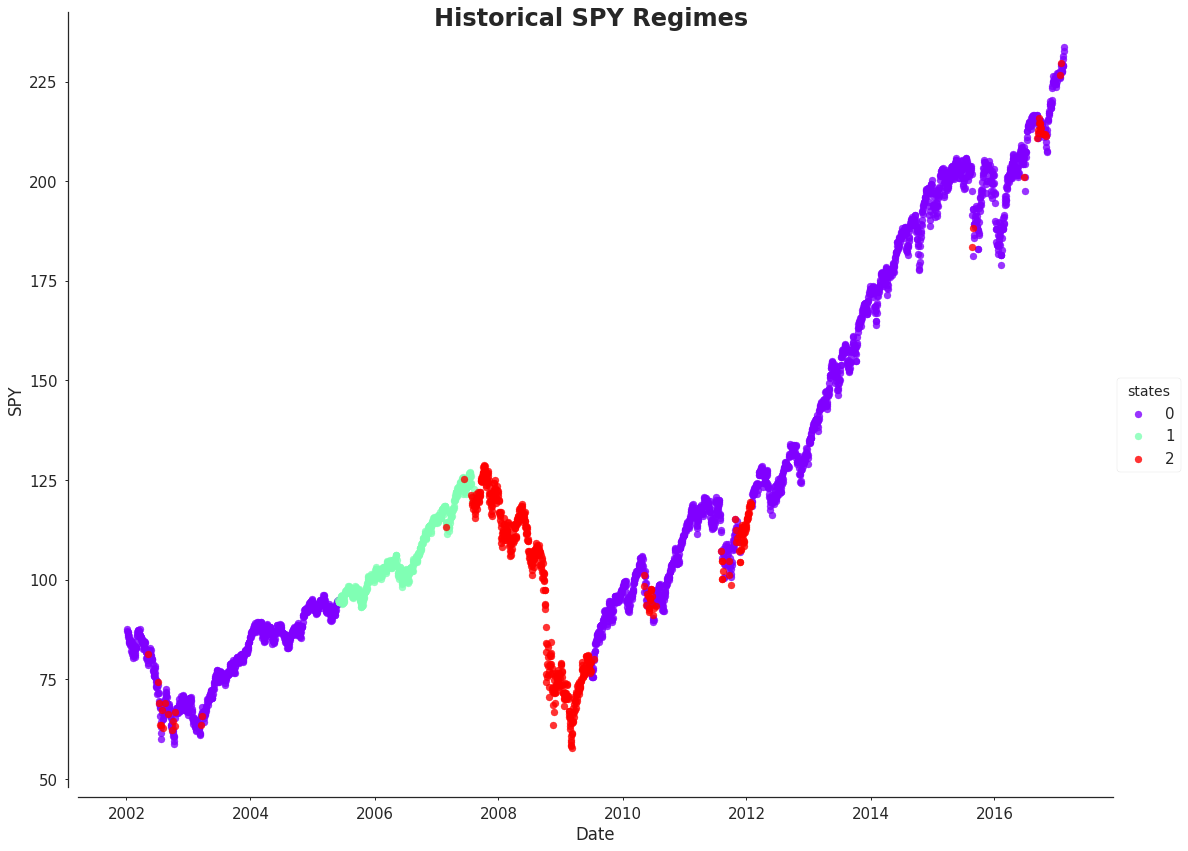 Here is the SPY price chart with the color coded regimes overlaid.