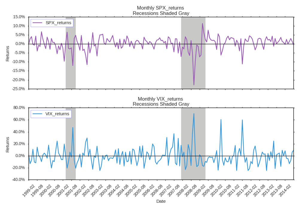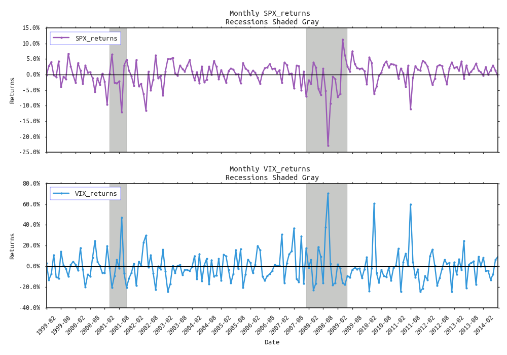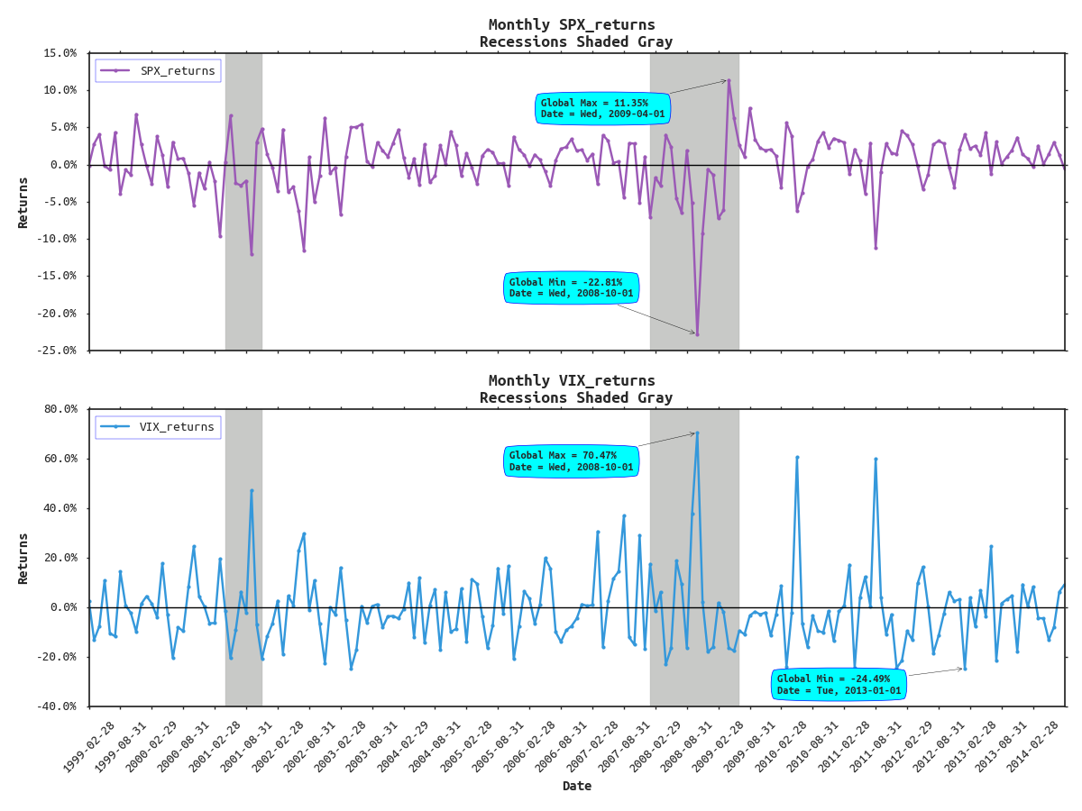 It's starting to look pretty good, but we can get even more fancy. Say we wanted to annotate the global maximum and minimum returns in each subplot along with their respective dates for SPX and VIX . That could be a challenge. To do this we first need to extract the max/mins and idxmax/idxmin for both series.