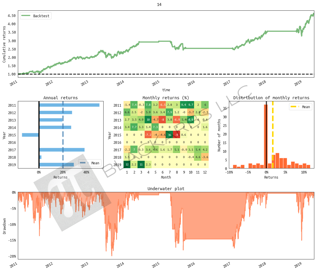 Of the basic strategies, strategy number 9 was the only strategy to avoid a losing year while having a significant amount of trading in each year. From a risk-adjusted perspective it had one of the lowest calmar ratios of the top basic strategies and it’s average 5 worst drawdown durations was longer than 180 days. Strategies 19 and 14 had great risk-adjusted metrics however there were periods of significant inactivity.