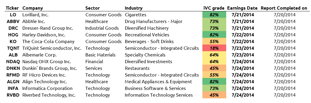 With the iVC reports showing some preliminary promise, I thought it would be worthwhile to begin tracking any potential predictive ability of the grading system. It's late so it's likely I'll have to update this post with better prose after I get some sleep. See this week's pre-earnings grades below. The reports are available for sale through the shop.