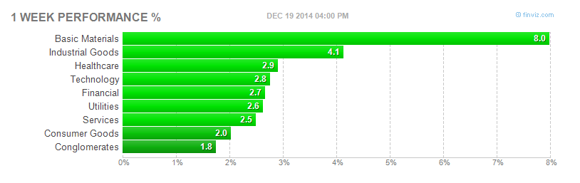 Basic Materials ( Energy ) crushed the performance of the next best performing sector. IMHO this type of outperformance does not immediately indicate a trend change on longer time frames but maybe for the short term ( 1 - 3 weeks ). In the case of ( EWC ) it looks like the stock made fresh 52 week lows on Dec 15, 2014 and 'bounced' with the broader market rebounding ~6% on the week. However the Canadian iShares ETF is still down ~3.5% on the month. I believe as the price continues to rise the ETF is entering a much better risk reward setup for a short entry.
