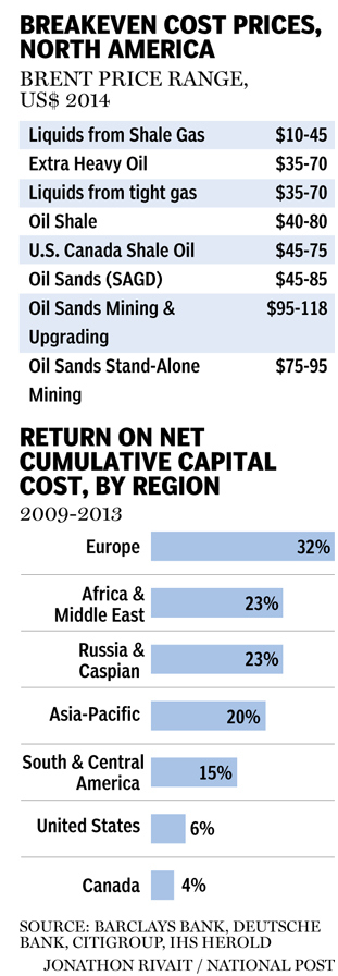 The above chart shows that there are some producers' breakeven Oil price as low as $45. That estimate may well be tested. My concern is that Canada has the lowest return on net cumulative capital cost according to Barclays et al.