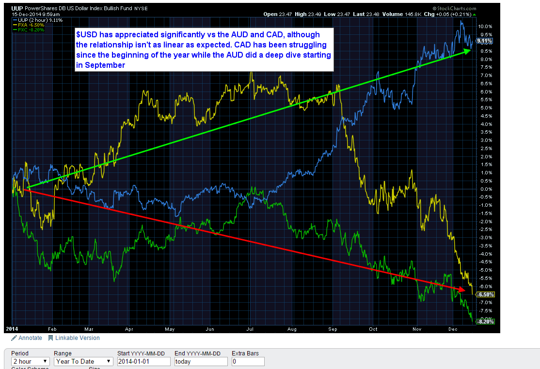 2. The $USD continues to strengthen relative to other global currencies. This is especially true for the commodity currencies of Australian and Canadian dollars.