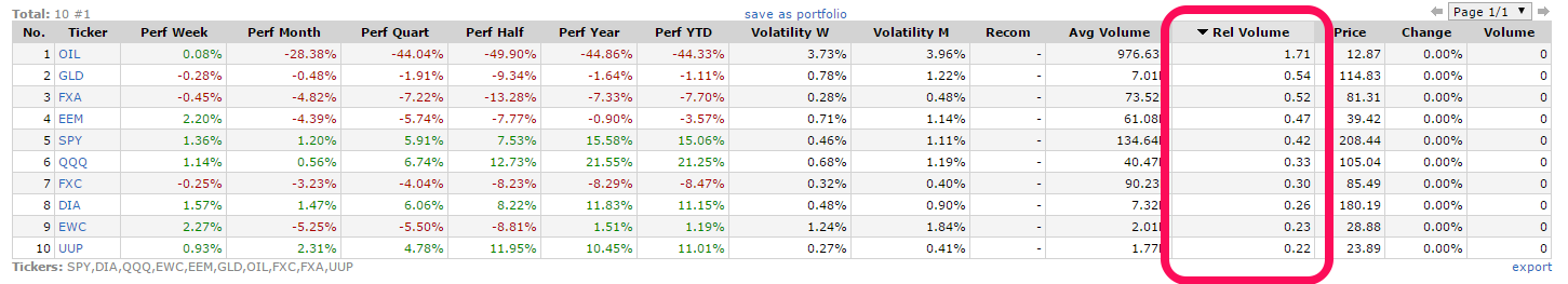Except for ( OIL ) which traded at 1.7x average volume the other ETF's experienced anywhere from 0.5x to 0.2x their average volume during the last session. With this week's market open minutes away we will find out if conviction has returned via volume/relative volume throughout the week.